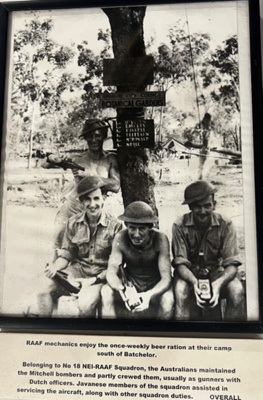Belonging to No 18 NEI-RAAF Squadron, the Australians maintained Mitchell bombers and party crewed them, usually as gunners with Dutch officers whose members of the squadron assisted in servicing the aircraft, along with other squadron duties. OVERALL. Photo on display at Darwin Aviation Museum