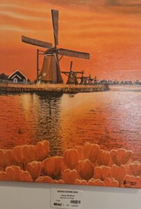 Australian artist Jenny Dodson, whose family background includes Dutch heritage, has created works that draw on the cultural imagery of the Netherlands. One of her notable pieces is Monochrome (2025): tribute to my Dutch heritage, a painting of a traditional Dutch windmill. In this work, Dodson uses a restrained palette
